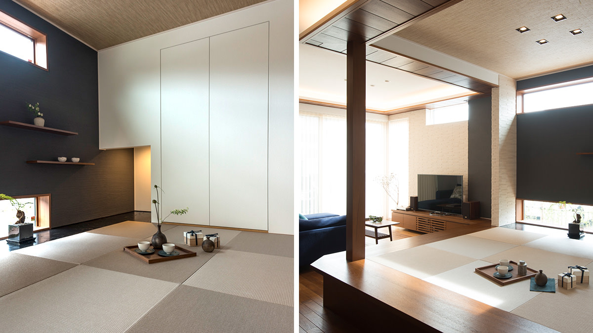 1階の中心=リビングとダイニングキッチンの間に據えたのは、シックな黒の塗り壁や琉球畳によって現代風にデザインした和の空間です。床のレベルを約40センチ上げることで、リビングにいる家族と視線が交わり、1階全體に一體感が生まれます。高窓と地窓から光を適度に取り込みつつ、隣地の景色の見え方にも配慮しました。