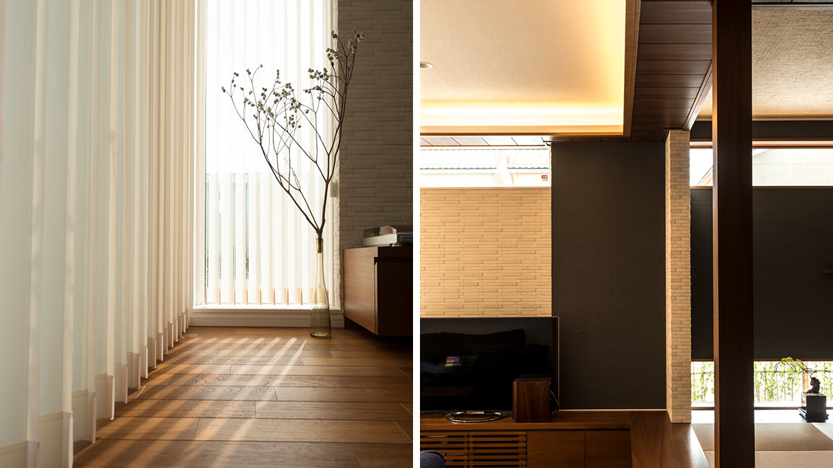 バーチカルブラインドから差し込む光がリビングに美しいストライプを描くよう設計。室內にいながら、四季の移ろいを感じることができます。また、リビング、キッチン、畳コーナーに木の化粧天井を連続して配置しました。間接照明のやわらかな光が空間全體を包み込みます。