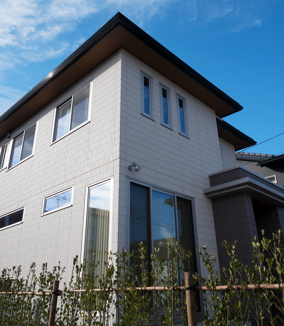 木の風合いを感じる和モダンな家を、というご要望に応えました。東西に奧行きのある土地形狀を生かし、玄関前に駐車スペースを確保。プライバシーを保ちながら、開放感と採光をかなえる住まいをご提案しました。