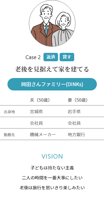 50代で家を建てるので、老後のローン負擔が心配。でも、夢は世界中を旅すること。定年後のローン負擔は軽くして、二人の時間を大切に、自由に楽しみたい。そして、もし萬が一のことがあっても、パートナーに家を殘して安心させたい。