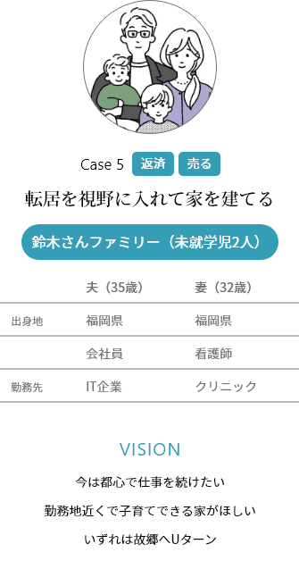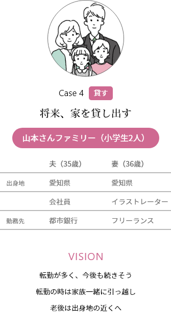 夫の全國転勤で、日本各地を家族で転居。この春ついに地元の配屬に。また転勤するかもしれないけれど、このタイミングで家を建てたい。もし転勤になったら、家は一時的に貸そう。家賃収入があれば家計も安心。將來戻ってきて、また住む日まで。