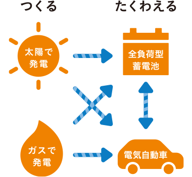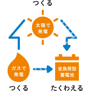 電気をつくる太陽光発電システムとエネファーム、電気をたくわえる全負荷型蓄電池の「3電池連攜」によって、雨天でも約8日分※2の電力と暖房?給湯を確保できます。