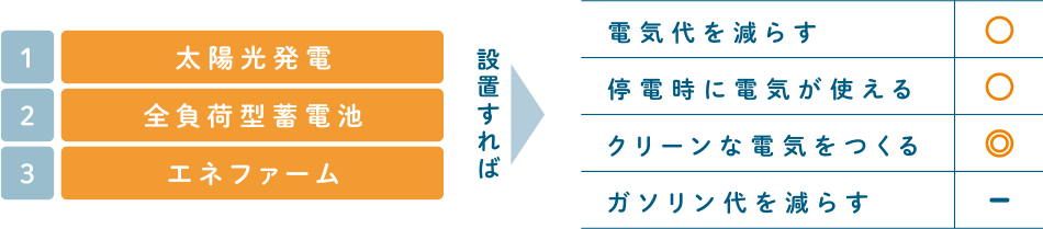 買電だけでなく、①太陽光パネルと②エネファームでつくった電力を利用することで、毎日の電気をおトクに使える。