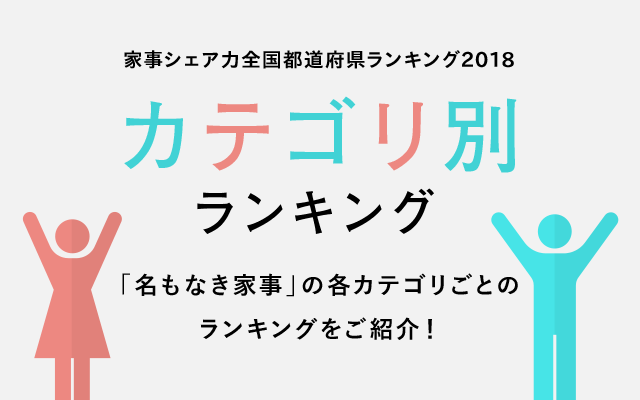 1位岡山県は「食事をつくる」「食卓を拭く」「使った道具や食器を洗う」の名もなき家事がいずれも3位以內に入っており、「料理」に関する一連の家事シェア力が高いことがわかります。2位大阪は「使った道具や食器を洗う」で1位、3位群馬県は「食事をつくる」で1位、4位奈良県は「獻立を考える」で1位を獲得している。