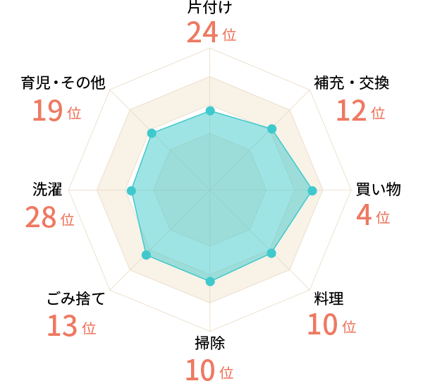 家事コミュニケーションが取れており、夫婦の時間を大切にする県民性。「買い物」「料理」を一緒に取り組むことが家事認識のズレをなくし、満足度向上につながっています。「洗濯」「片付け」に関する名もなき家事のシェアが家事シェア力向上の鍵を握っています。