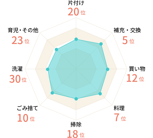 「補充?交換」「料理」「ごみ捨て」で10位以內(nèi)と良い結(jié)果でした。その反面、「洗濯」については下位の結(jié)果となりました。桜島の降灰の影響で他の地域と比べても「洗濯」の負(fù)擔(dān)と不満が大きいので、意識的に家族內(nèi)で「洗濯」について話し合いをしてみましょう。