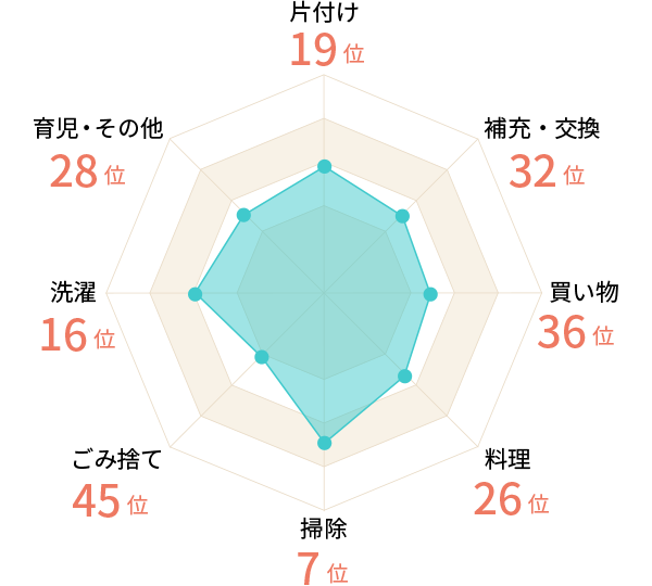 「お風呂の掃除」「玄関まわりの掃除」など「掃除」に関する家事シェア力が高いです。「ごみの種類を把握して分類」「郵便物をチェックし不要なチラシを捨てる」など「ごみを分類」する意識づけができれば、家事シェア力はさらに向上するでしょう。