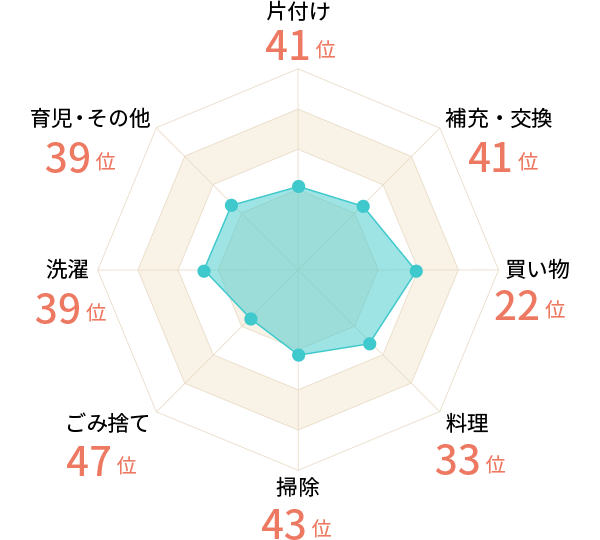 共働き率が高く、家事年収が高い(家事総量が多い)にも関わらず、家事シェア力の順位が低い結(jié)果となりました。「ごみ捨て」「掃除」など取り組みやすい家事がシェアできていないので、家族でルールをシェアすることから始めてみましょう。