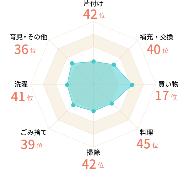 共働き率が1位で、家事年収が高い(家事総量が多い)にも関わらず、家事シェア力の順位が低い結果となりました。「買い物」「育児」などやってる感が強い家事だけでなく、細々とした名もなき家事についての理解を深めることが大切です。