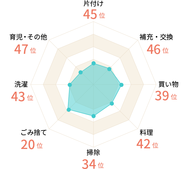 家事負擔者の満足度、夫婦の認識度ともに40位臺という低い結果となりました。夫婦の時間や、家事に関するコミュニケーションが不足していることが要因だと考えられます。家事を、家族の時間をつくるチャンスだと思って、家事に取り組んでみましょう。