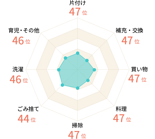 「片づけ」「補充?交換」「買い物」「料理」「掃除」の5つの項目での最下位が影響して、総合順位で最下位という結果となりました。女性が負擔しがちな名もなき家事についての知識が足りないので、まずは家族みんなで名もなき家事について知ることから始めてみましょう。