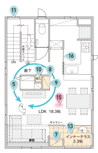 運(yùn)動(dòng)不足?ストレス解消のため、ごはんスペースを中心に、LDKから廊下まで回遊できる動(dòng)線を計(jì)畫(huà)。室內(nèi)を自由に動(dòng)き回れます。
