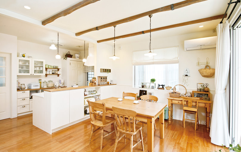 みんなで一緒に料理をつくる楽しさがある対面式キッチン、調理しながらダイニングにいる家族や友人との會話もはずみます。ガラス瓶やバスケットを使って、「見せる収納」もおしゃれです。