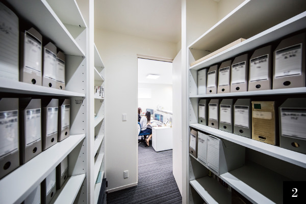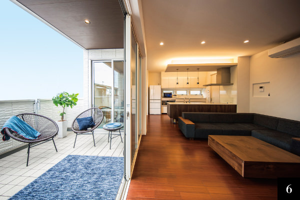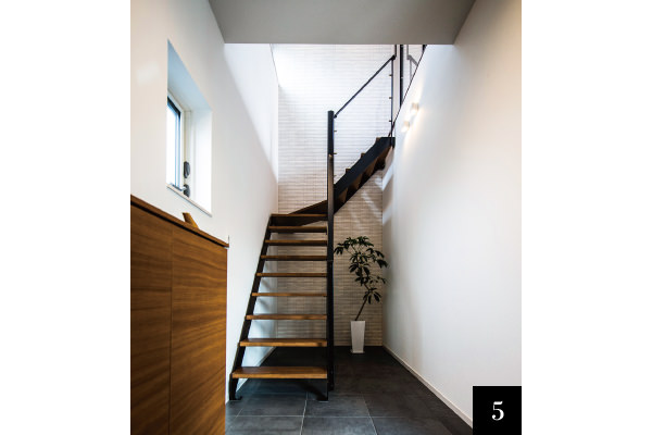 1.凹凸のある立體感が個性的な外観 2.整然とファイルが並ぶ収納棚 3.來客にも好評の応接スペース 4.エントランスから見る自宅玄関 5.吹き抜けの自宅玄関ホール 6.一體感のあるリビングとバルコニー