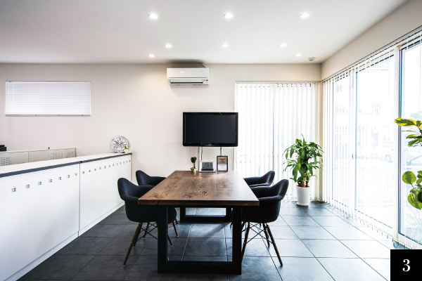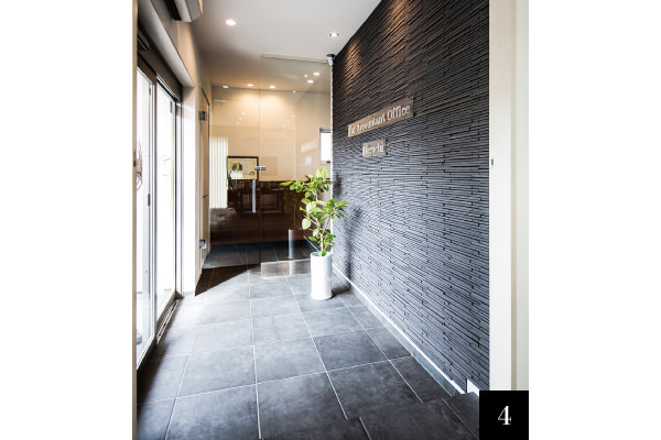 - 事務所のタイル貼りの壁やサイン、重厚感のある床タイルは、お客さまにもご好評。