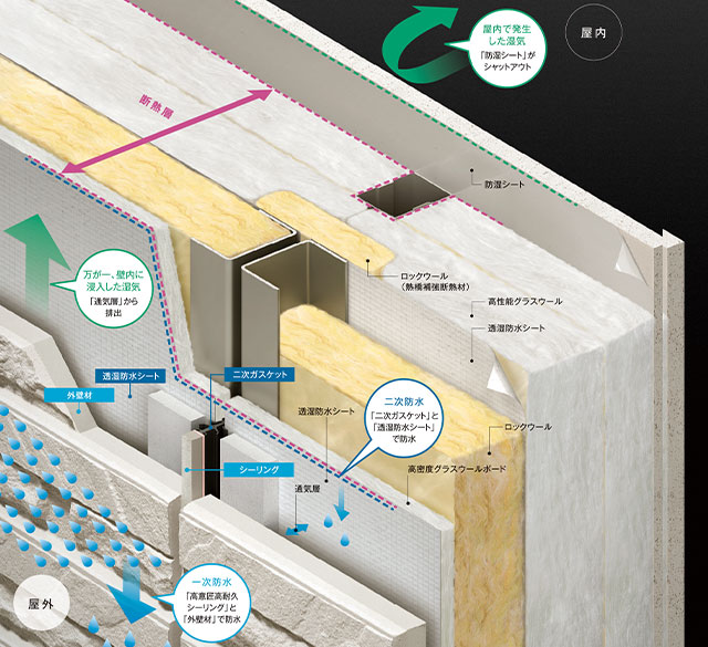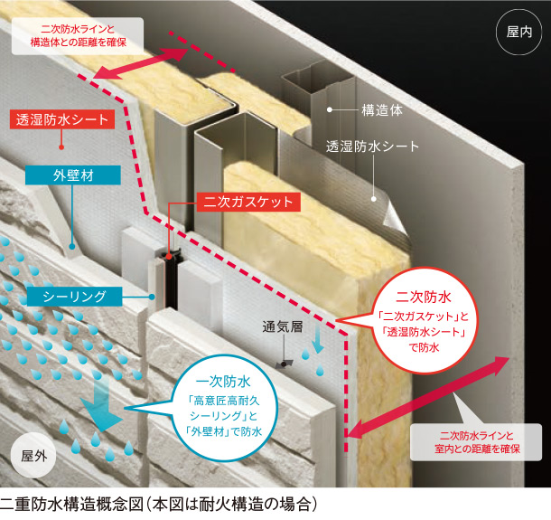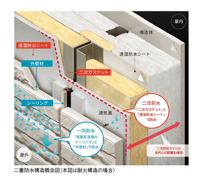 外壁目地部を「高意匠高耐久シーリング+二次ガスケット」とし、一次防水の部分から雨水が浸入しても「二次ガスケット」と「透濕防水シート」が防ぎ、「通気層」から外部へ排水します。