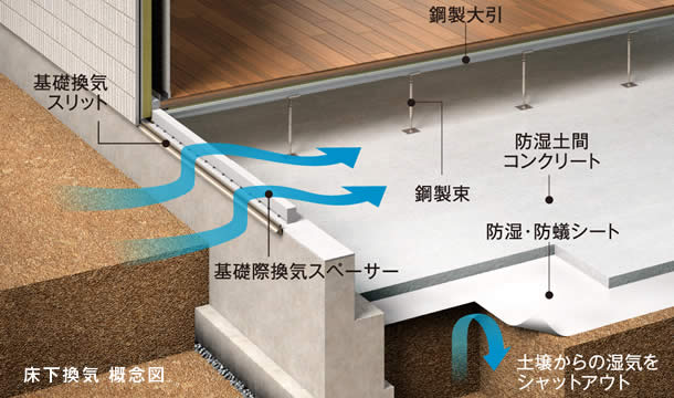 ![床下のリスク管理[防濕?防蟻] 地盤防濕と床下換気により結露リスクの軽減を図ります 床下換気 概念図](images/rn01/technology2_img14.jpg)