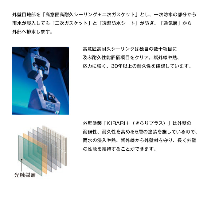 外壁塗裝「KIRARI+(きらりプラス)」は外壁の耐候性、耐久性を高める5層の塗裝を施しているので、雨水の浸入や熱、紫外線から外壁材を守り、長く外壁の性能を維持することができます。