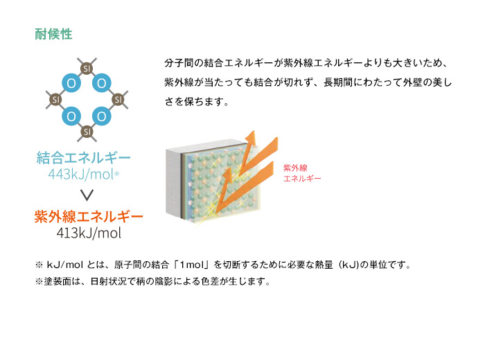 分子間の結合エネルギーが紫外線エネルギーよりも大きいため、紫外線が當たっても結合が切れず、長期間にわたって外壁の美しさを保ちます。