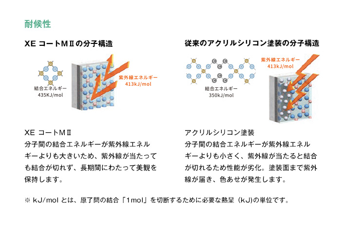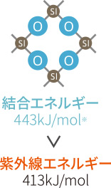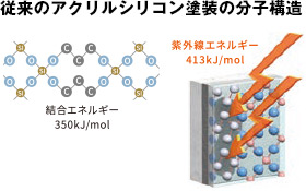 分子間の結合エネルギーが紫外線エネルギーよりも大きいため、紫外線が當たっても結合が切れず、長期間にわたって美観を保持します。