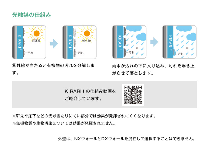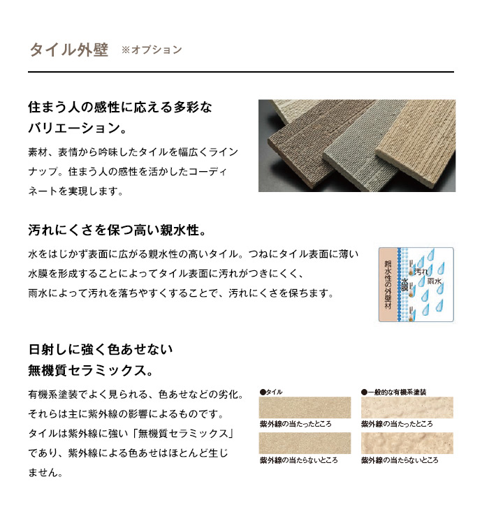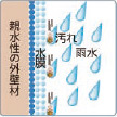 水をはじかず表面に広がる親水性の高いタイル。つねにタイル表面に薄い水膜を形成することによってタイル表面に汚れがつきにくく、雨水によって汚れを落ちやすくすることで、汚れにくさを保ちます。