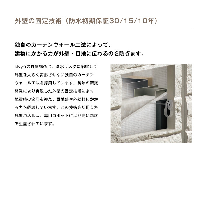 skyeの外壁構造は、漏水リスクに配慮して外壁を大きく変形させない獨自のカーテンウォール工法を採用しています。長年の研究開発により実現した外壁の固定技術により地震時の変形を抑え、目地部や外壁材にかかる力を軽減しています。この技術を採用した外壁パネルは、専用ロボットにより高い精度で生産されています。