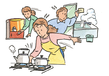 地震に伴う火事の被害はとても大きいものです。グラッと來たら、まず火の始末。コンロの火は誰、ストーブは誰、お風呂の火は誰…と、あらかじめ家族で分擔しましょう。