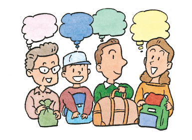 高齢者や體の不自由な人、けが人などに聲をかけ、みんなで助け合いましょう。