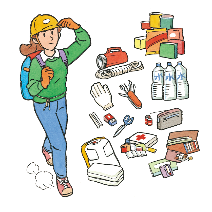 避難所までの道のりは、必ずしも安全ではありません。電柱が倒れてきたり、瓦や塀が崩れたり…。様々な危険から身を守るために、長袖の上著、長ズボン、運動靴、軍手に帽子やヘルメットなどを著用しましょう。また、両手を自由に使えるように、カバンはリュックをお薦めします。