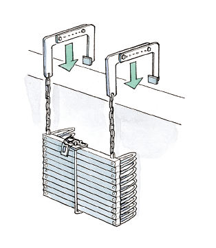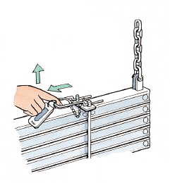 真下に人がいないか確かめてから、安全ピンを引き抜いてバンド止め金具をはずします。