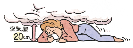 煙の中を避難する場合は、ハンカチやタオルを口に當て、背を低くし、這うようにして煙を吸わないようにします。空気があるのは床上20cm程度です。