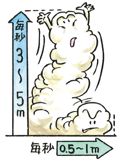 煙が上昇する早さは毎秒3?5m、橫方向の広がりは毎秒0.5?1mです。煙だけでなく目に見えない一酸化炭素等の有毒ガスの危険も心に留めておく必要があります。