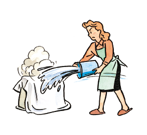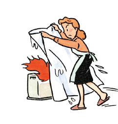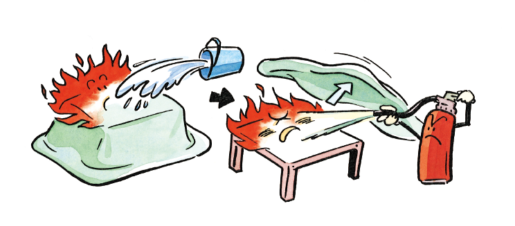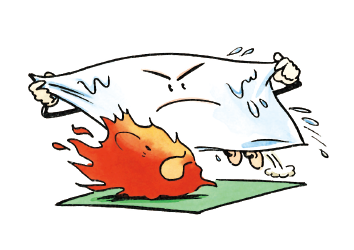 空気を遮斷して消火する方法。ふきんやタオル、シーツなどを水でぬらして火の上からかける、または毛布、布団などをかぶせて上から水をかけます。