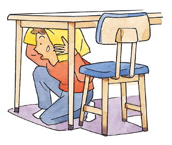 あわてて外に飛び出さないで、地震が完全におさまるまで座布団やクッションなどで身を保護し、機やテーブルの下に入って身を守りましょう。その際、機の腳を動かないようにしっかりと握っておきます。