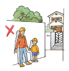 家から出て緊急時避難場所へ移動する場合は、倒壊の危険があるブロック塀のそばや狹い道路は避け、なるべく広い道を選ぶこと。電柱が倒れてくる場合があります。頭をしっかりガードしながら、狀況判斷を的確に。
