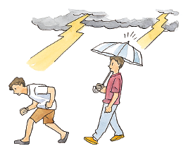 雷雨時にはなるべく姿勢を低くして避難します。金屬は身につけていても大丈夫ですが、所持品が頭より高く突き出ないように注意しましょう。傘をさすのも厳禁です。