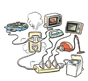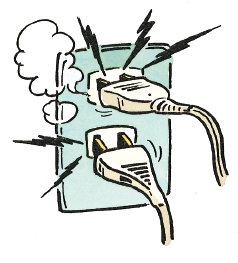 家庭內でもよく見かけるタコ足配線。テーブルタップ(延長コード)を利用して、ひとつのコンセントで何臺もの器具を使うとコードが加熱する原因になります。