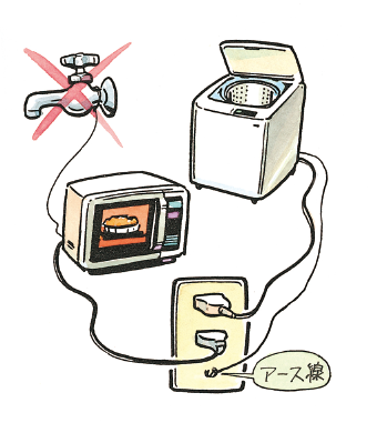 アースは電気器具と地面の間に電路をつくる裝置。感電の防止や器具の感度を向上させる大切な設備です。洗濯機、冷蔵庫、クーラーなどの機器は、アースする必要のある電気器具。なかでも水を使用する洗濯機は、必ずアースターミナルにアース線を接続してください。なお、ガス配管?ガスコック?水道栓等をアースとして使用しないでください。