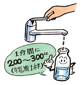 寒冷期には、外気に直接さらされている水道管が凍結することがあります。夜間には、水栓から1分間に200?300cc(牛乳ビン1本半程度)の水を出したままにしておきましょう。