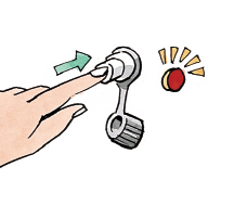 - 1まず、グレーのテストボタンを押します。「異常」という文字の表示とハンドルが落ちて電気が切れると正常です。