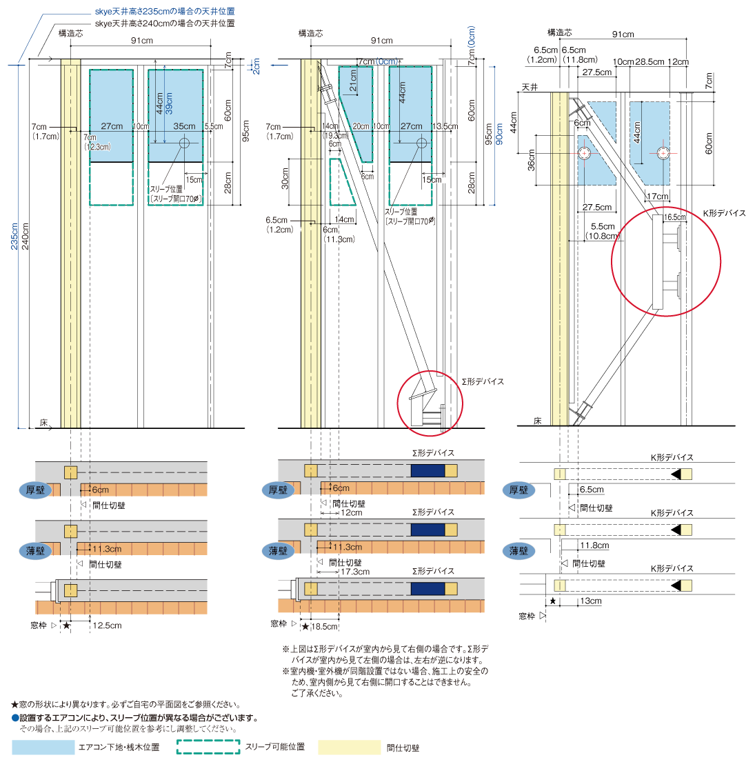青字の表記はskye天井高さ235cmの場合です。●左: 【xevoΣ 非耐力壁】【skye】 の場合