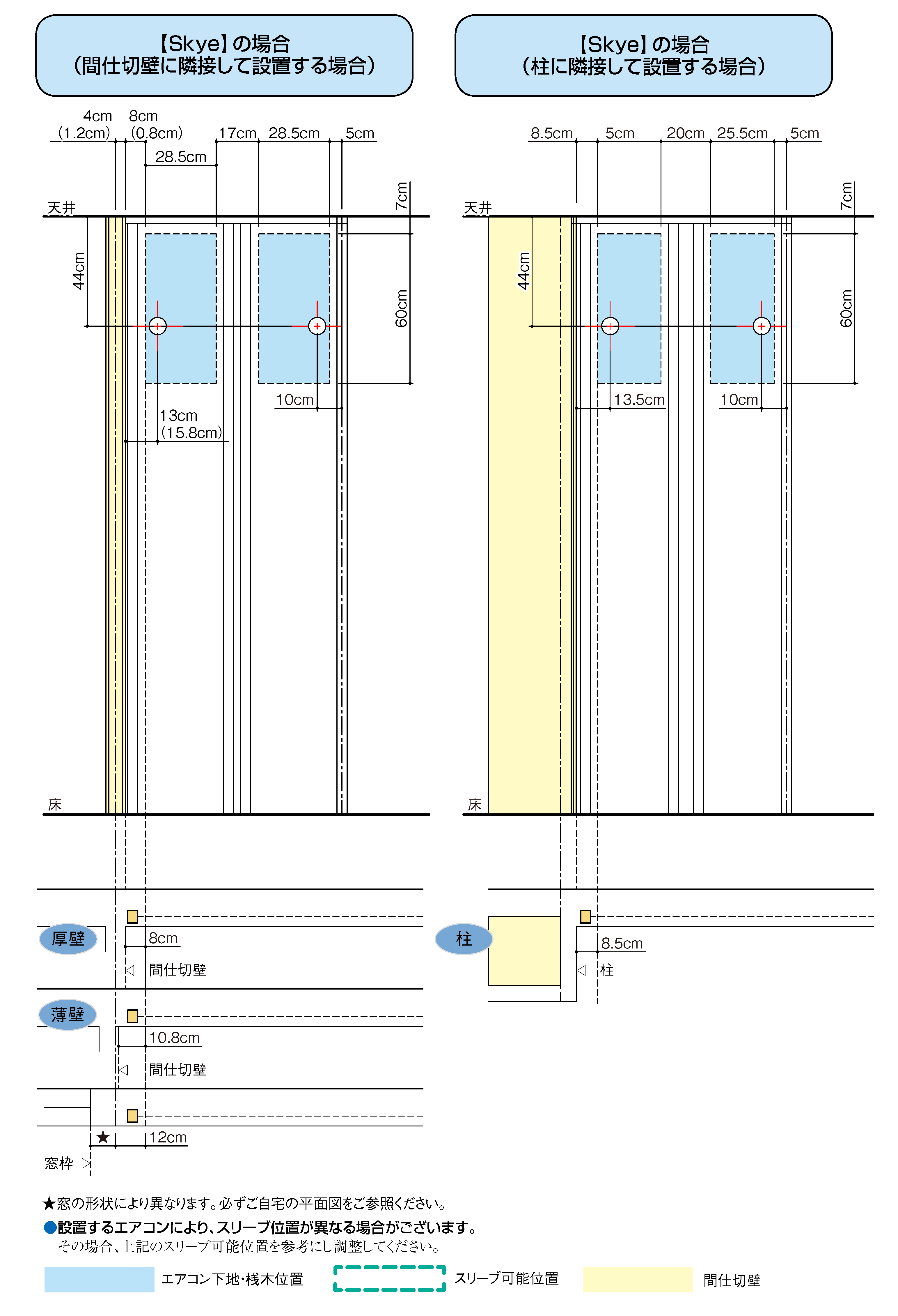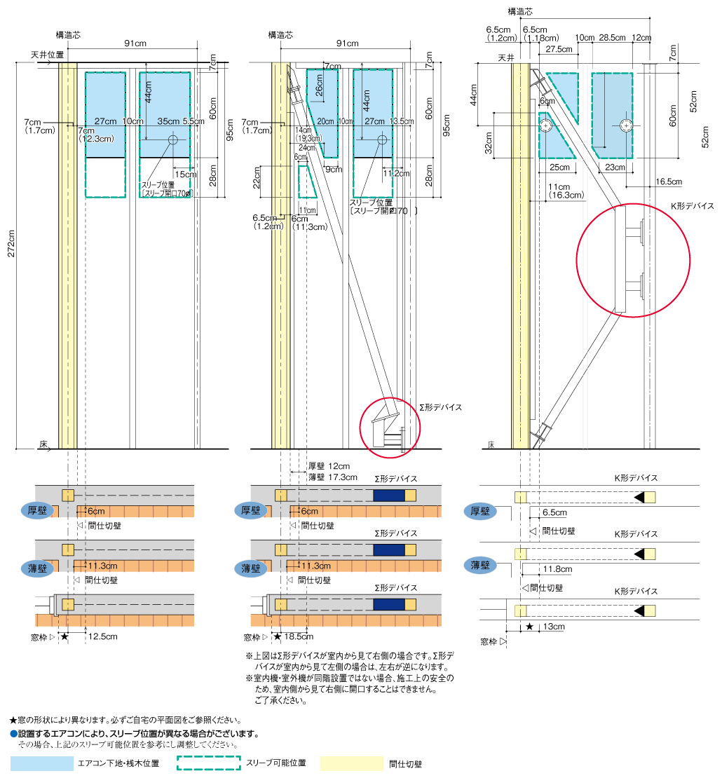 - ■ 近年、エアコンが小型化しています。エアコン用スリーブを抜く時、下地材にあたることがありますが、その際は下地材をカットしてスリーブ位置を調整してください。