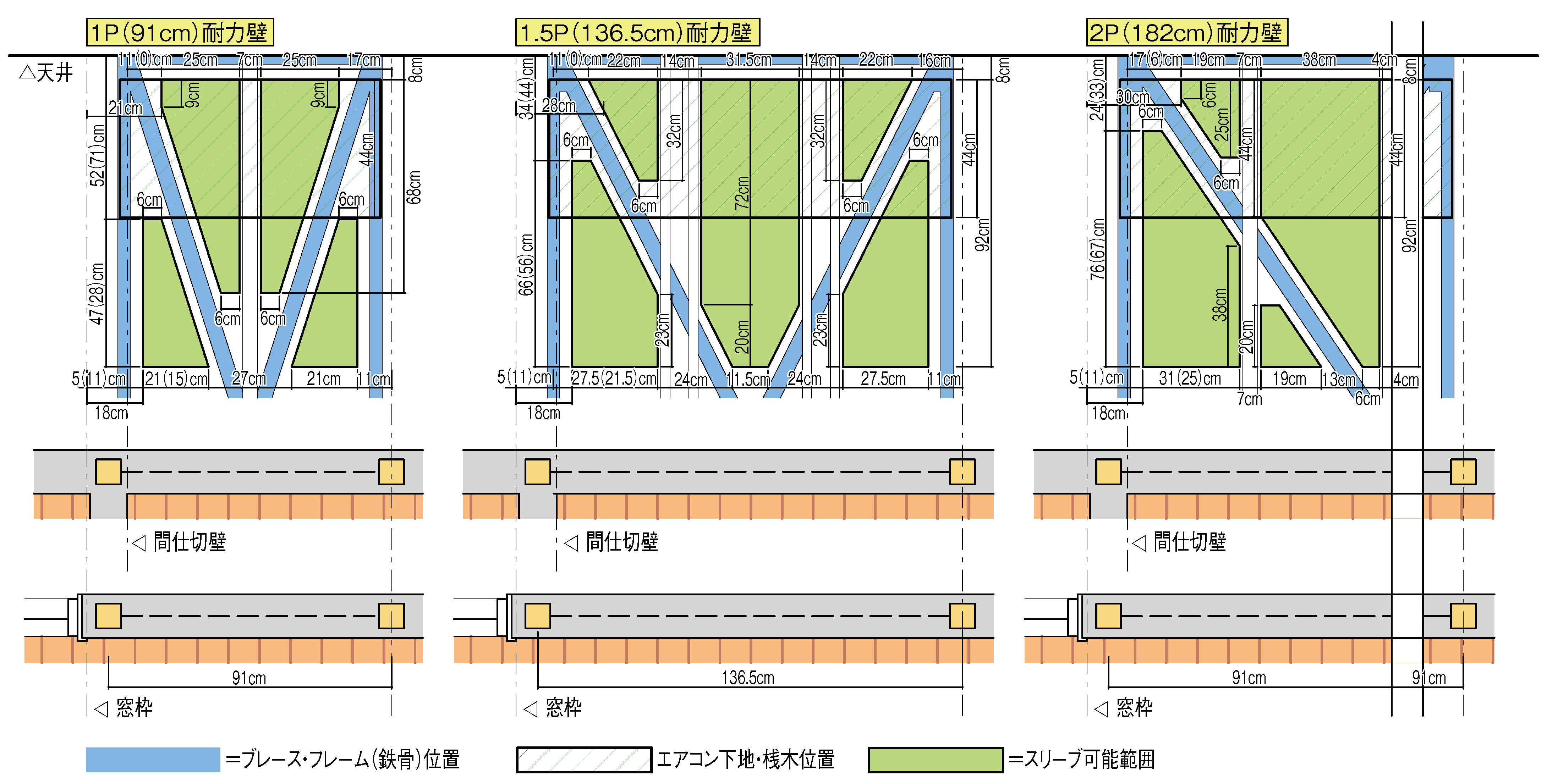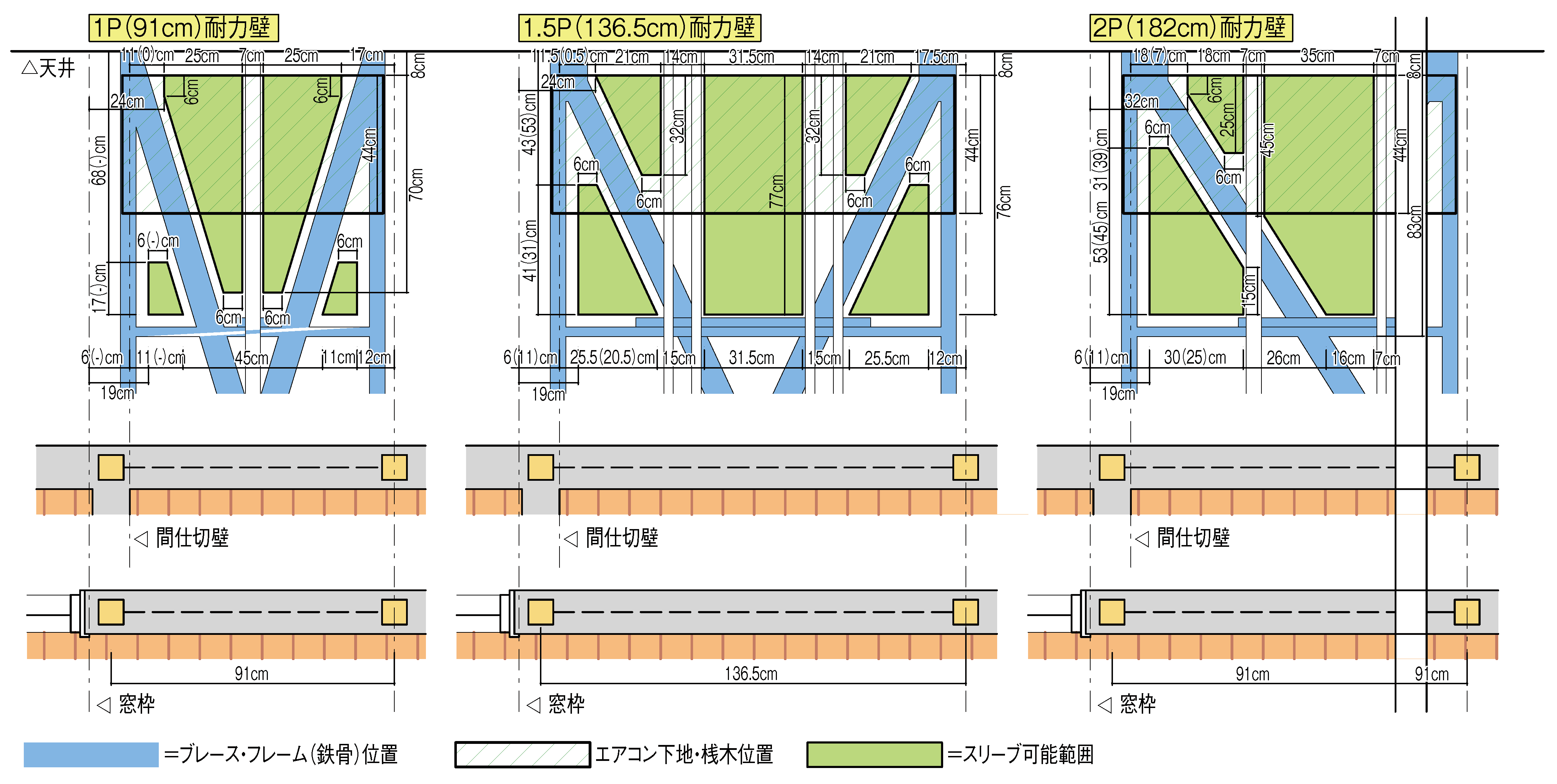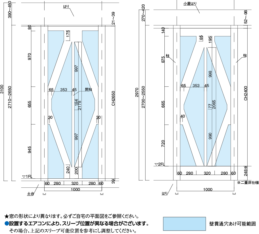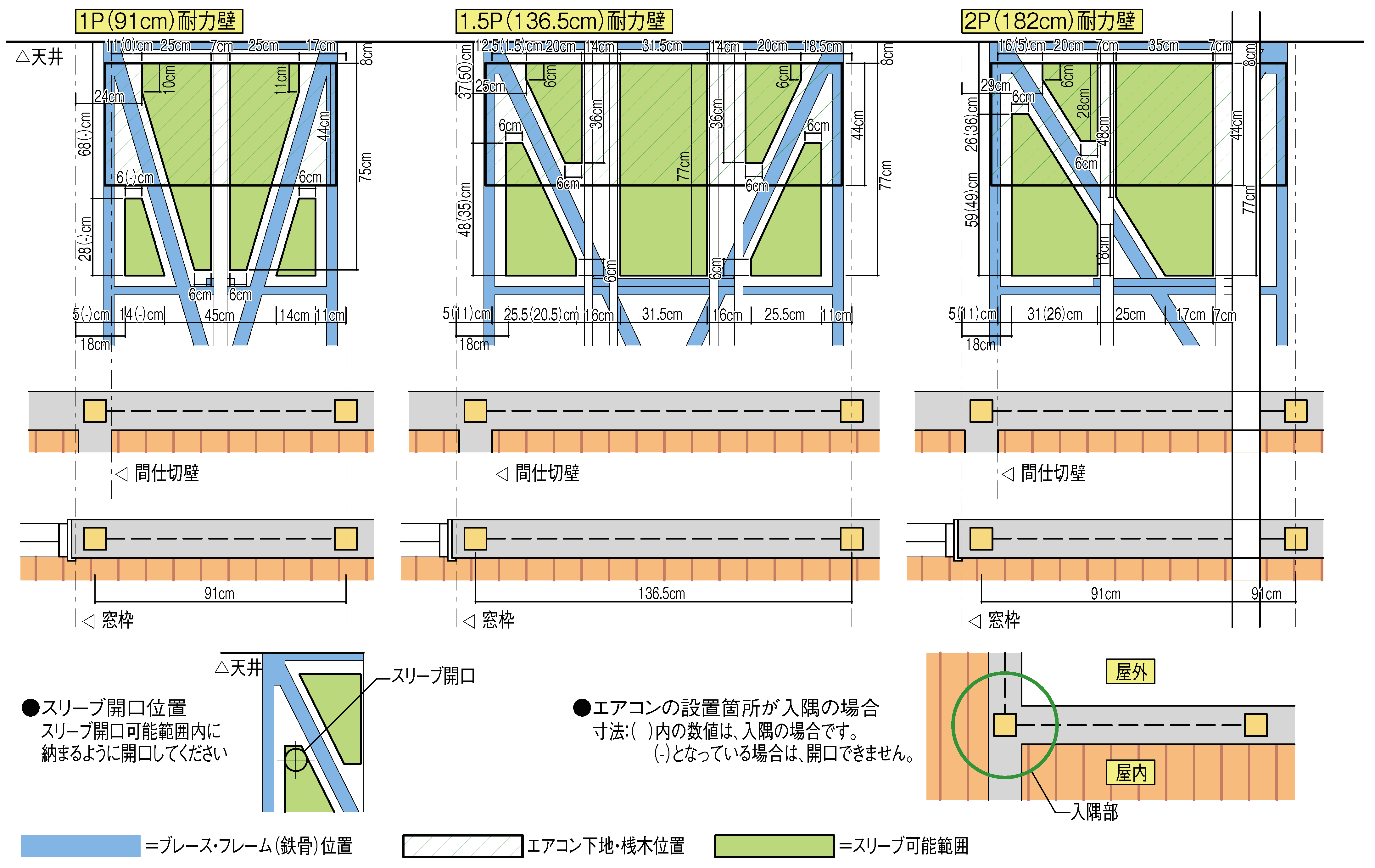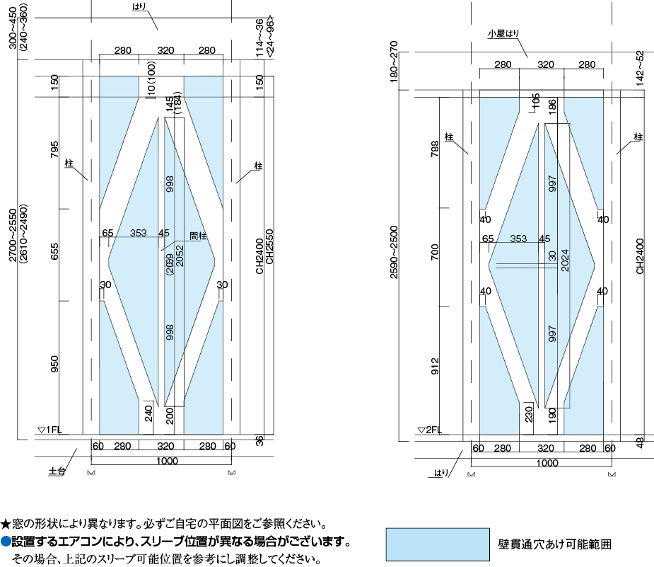 壁掛けタイプのエアコンは、石膏ボードの強度の問題がありますので、必ず「壁補強下地」のあるところへ取り付けてください。「壁補強下地」の位置については、施工図面をご參照ください。また、外壁にスリーブ(穴)をあける際、場合により構造上大切なブレースやフレーム(鉄骨)を傷めてしまうこともあります。また、外壁の內側に通っているガスや給排水の配管、電気の配線などを誤って傷つけてしまうと大変危険です。また、引戸?雨戸などの外裝材に干渉する場合があります。配管や配線外裝材などの位置をご確認ください。