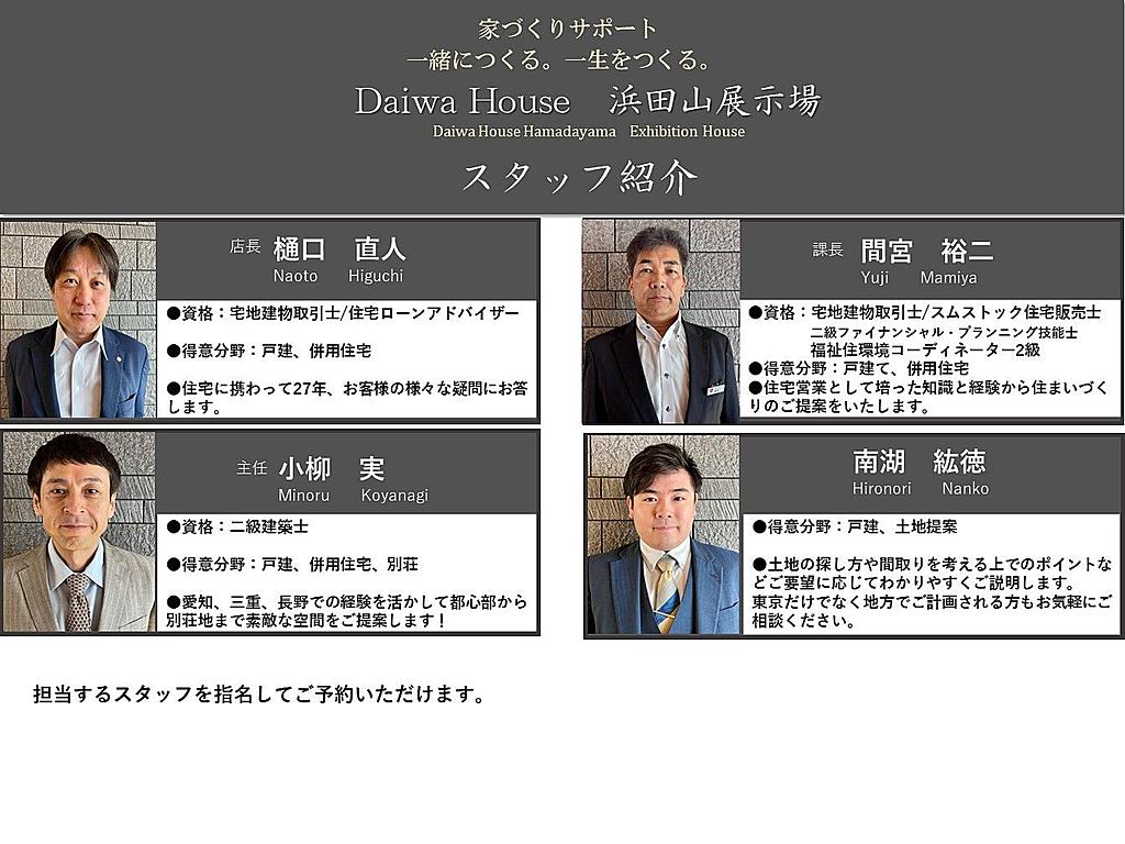 | アクセス | 【電車でお越しの場合】 京王井の頭線「浜田山駅」より徒歩7分 【お車でお越しの場合】 カーナビ入力は→杉並區高井戸東3-16 (ダイワハウスは人見街道沿い 南會場になります) ※無料駐車場を完備しております。 |
