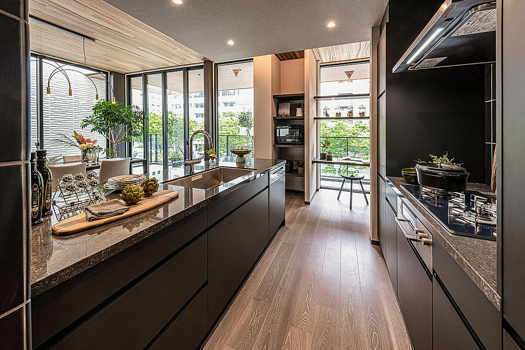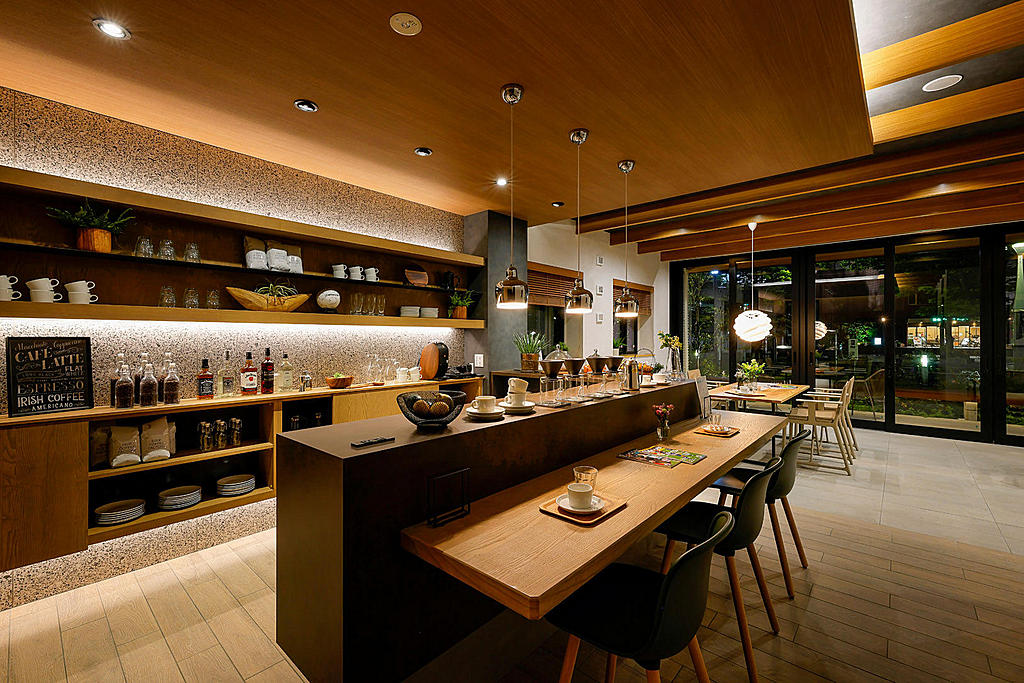 1F:外と內(nèi)が大開口でつながる開放的なオープンカフェリビング