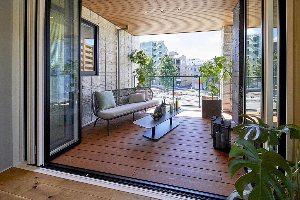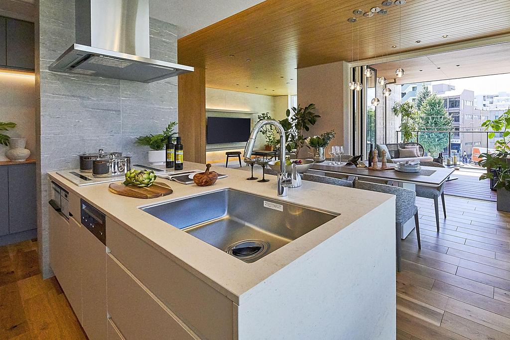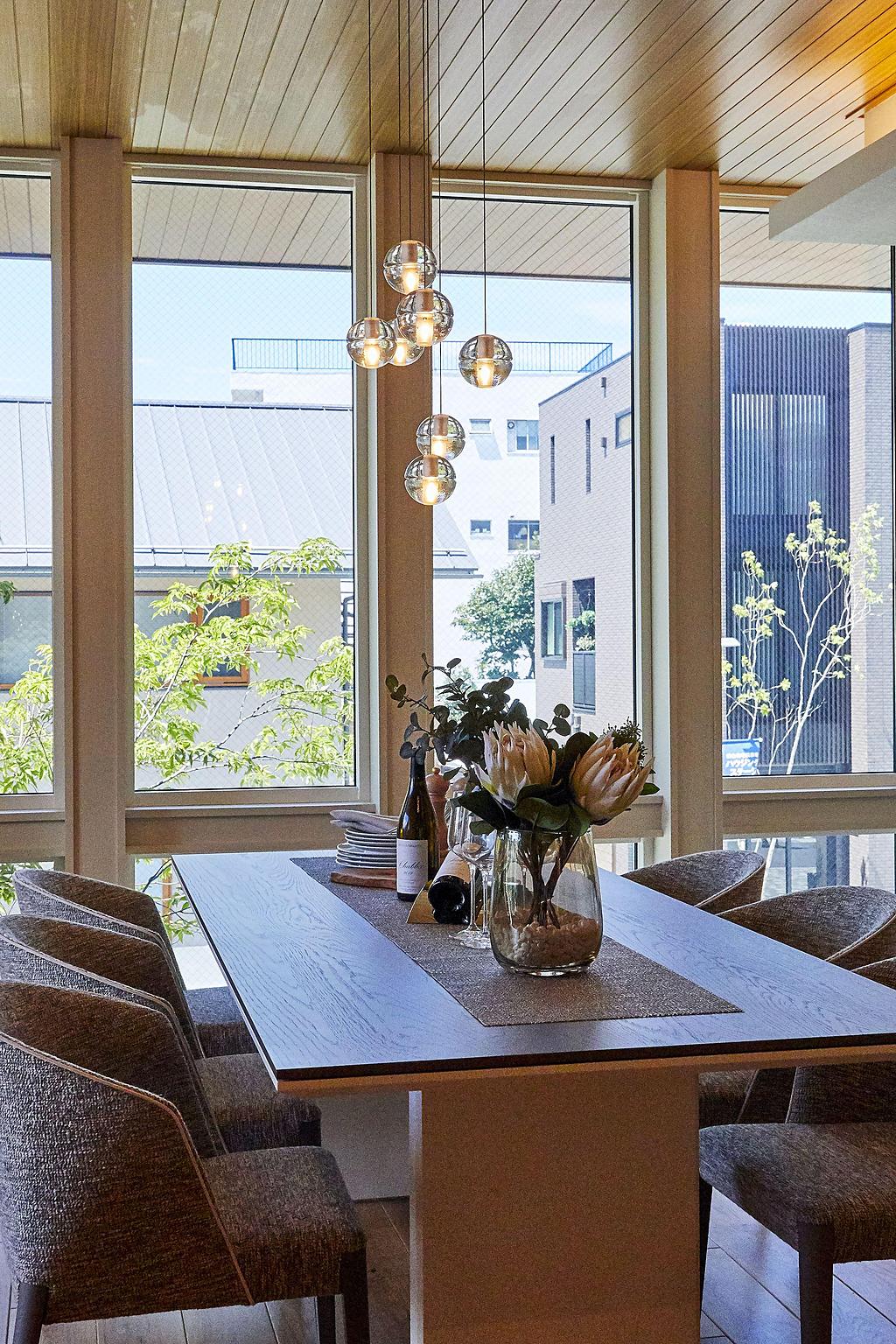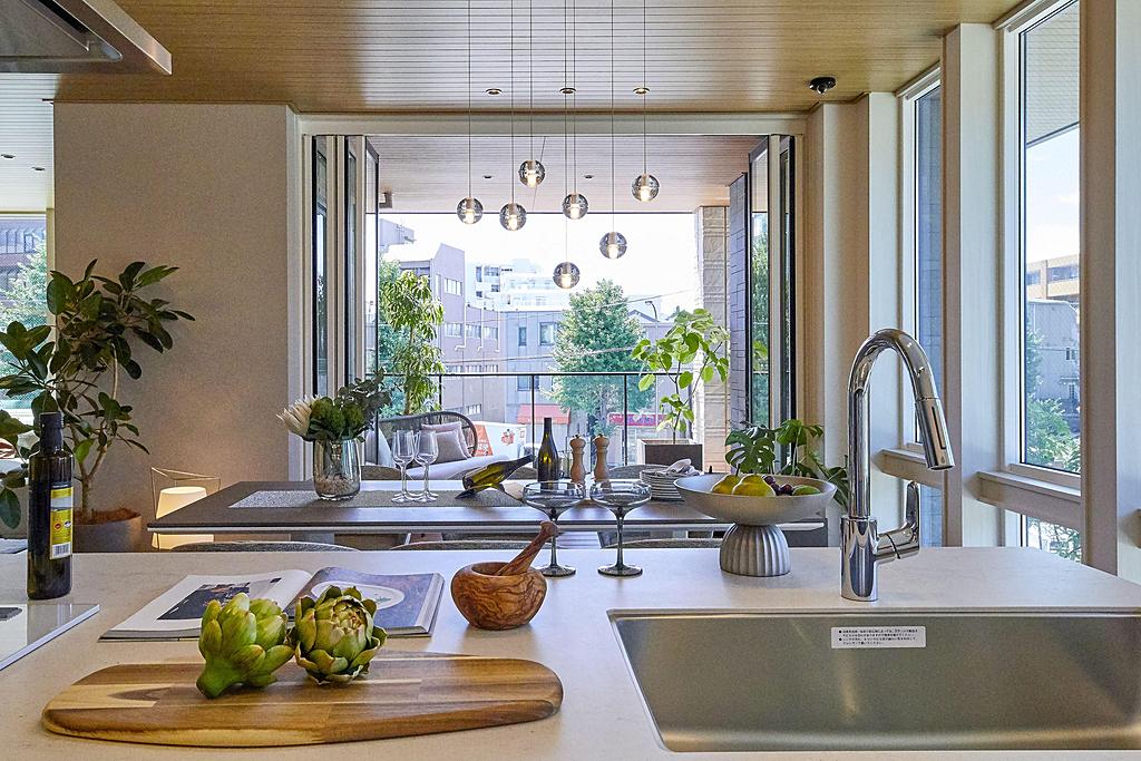 天井高2m72cmにあわせた「グランフルサッシ」、約5.4mの大開口「フルオープンサッシ」により室內と屋外がシームレスにつながり、クリアに広がる空間になっております。