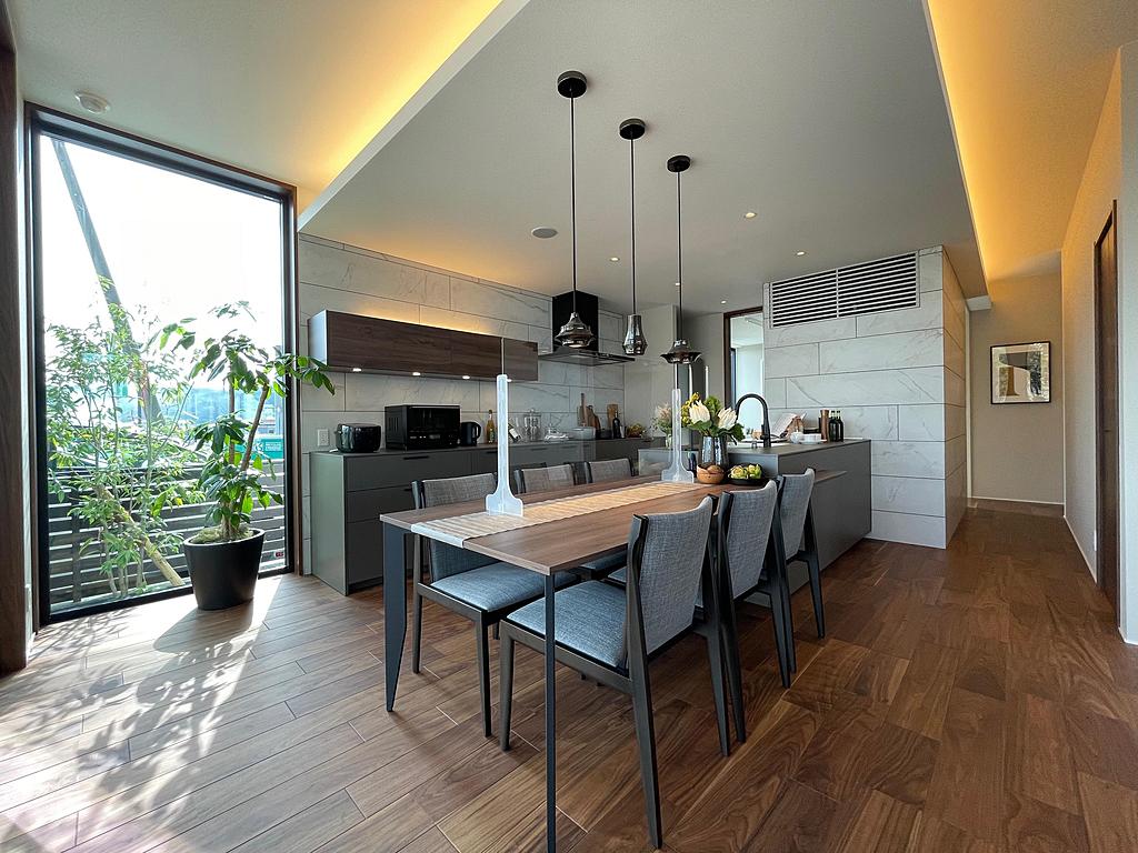 また、リビングダイニングは、天井まで伸びた連続大開口のグランフルサッシと2m72cmの天井高により、內に居て外に居る様な、ゆったりとした開放感のある空間をご體感いただけます。