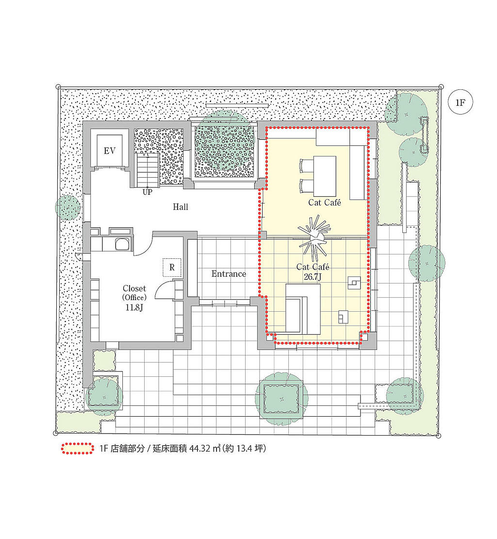 1階 店舗スペースには貓カフェを展示。床はメンテナンスしやすいフロアタイルを採(cǎi)用しています。