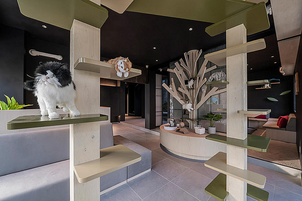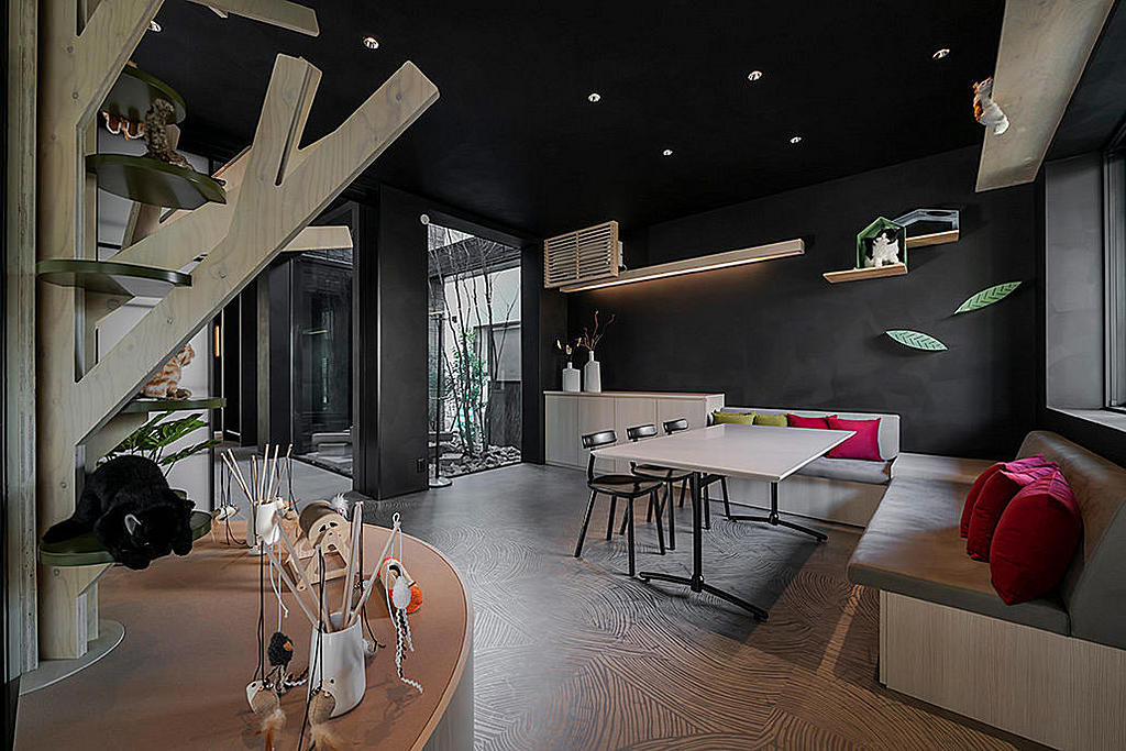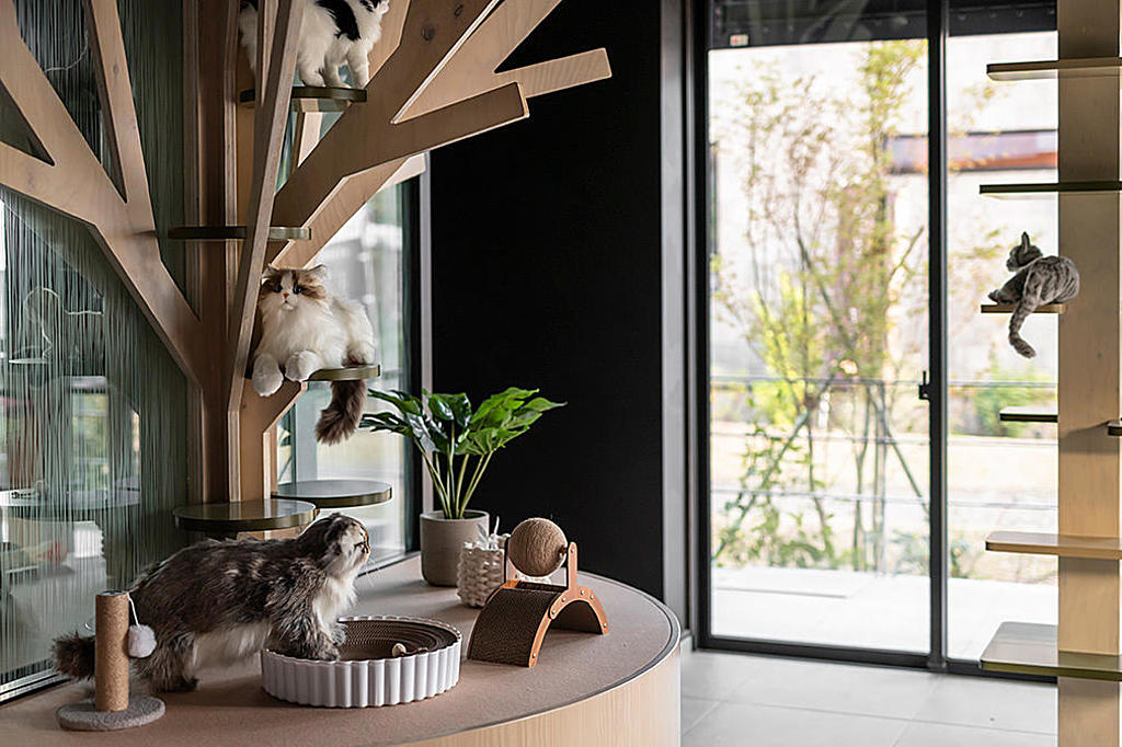 1階 店舗スペースには貓カフェを展示。造作でキャットウォークやキャットツリーを配置しています。