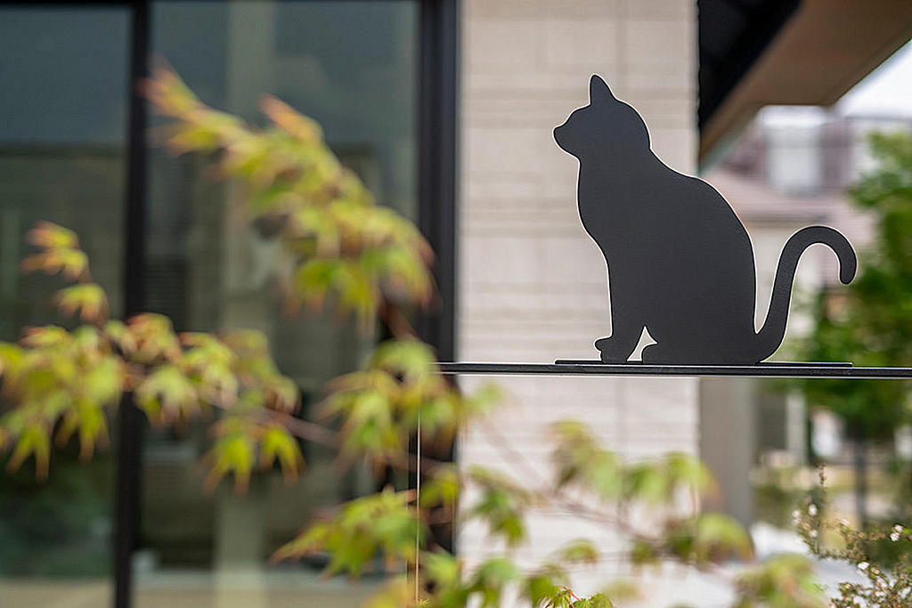 外構(gòu)手摺には貓のオリジナルプレートを配置。想いの詰まった世界に一つだけのものを作成可能です。